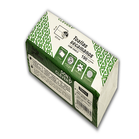 Toalla secamanos zig-zag gofrada, plegada en V, en calidad tissue de 2 capas, precorte superior en el envase para facilitar su extraccion.